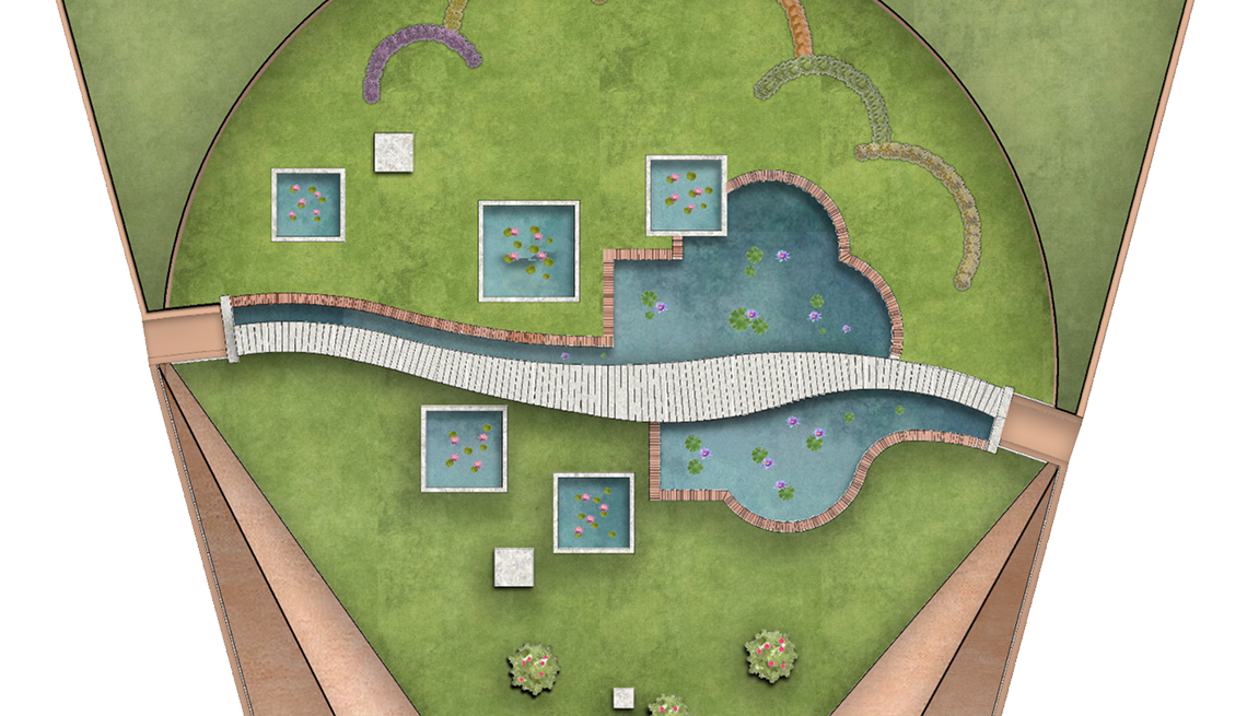 Located between the Garden of Wealth and the Garden of Progress, this garden is designed with  5 square ponds and a larger water body crossed by a bridge-like pathway. The garden will be laid out with lawns. At the focal point there will be, as in all the gardens,  a large granite cube.