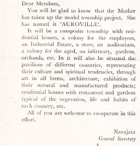 “The Mother has taken up the model township project. She has named it “AUROVILLE”.”