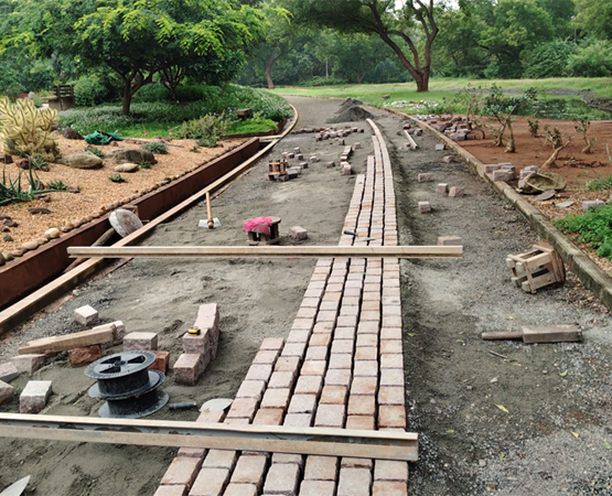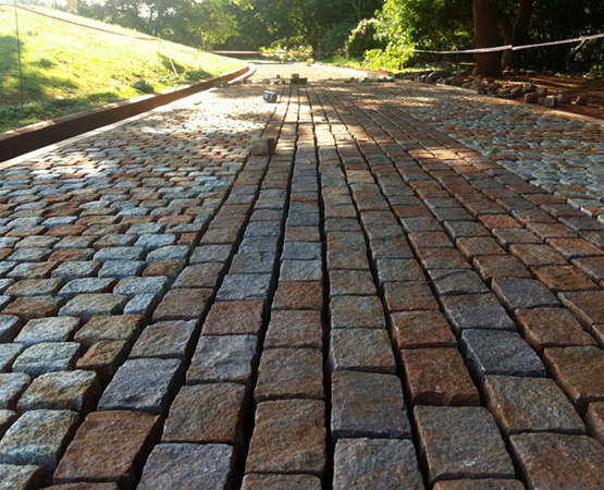 The Gardens of the Park of Unity are encircled by an Oval Road which is being clad with granite grey and red cobblestones. The Oval Road is 1.1 kilometer long. The section between the East and West Pathways to the North has already been paved. Work began in June 2025 to clad the Eastern section. Altogether about 520 meters remain to be clad