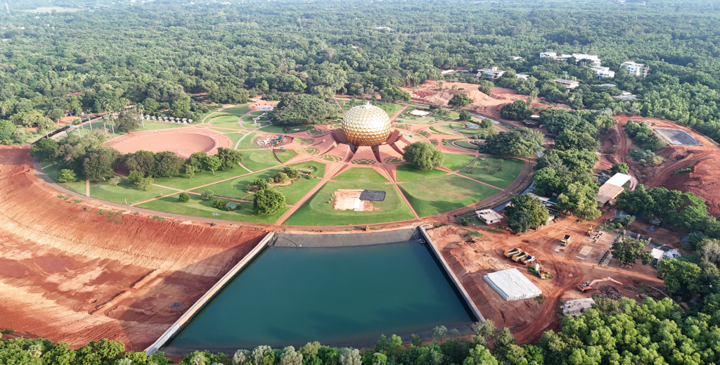 She took up an idea from Roger Anger, Auroville’s chief architect, that there should be an island at the center of Auroville surrounded by running water which would be used for the water supply of the city. And in 1970, in order to make Her wishes completely clear She wrote, “It has been decided and remains decided that the Matrimandir will be surrounded with water. However, water is not available just now and will be available only later; so it is decided to build the Matrimandir now and surround it with water only later; perhaps in a few years’ time… The Matrimandir will be built now and water brought round it later.”